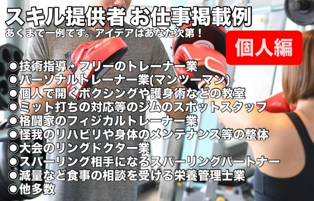 掲載例はあくまで一例。格闘技に関連するお仕事であれば、あなたのアイデア次第で、オリジナルのお仕事を作成することができます。アカウント登録0円、掲載費は無期限で0円です!